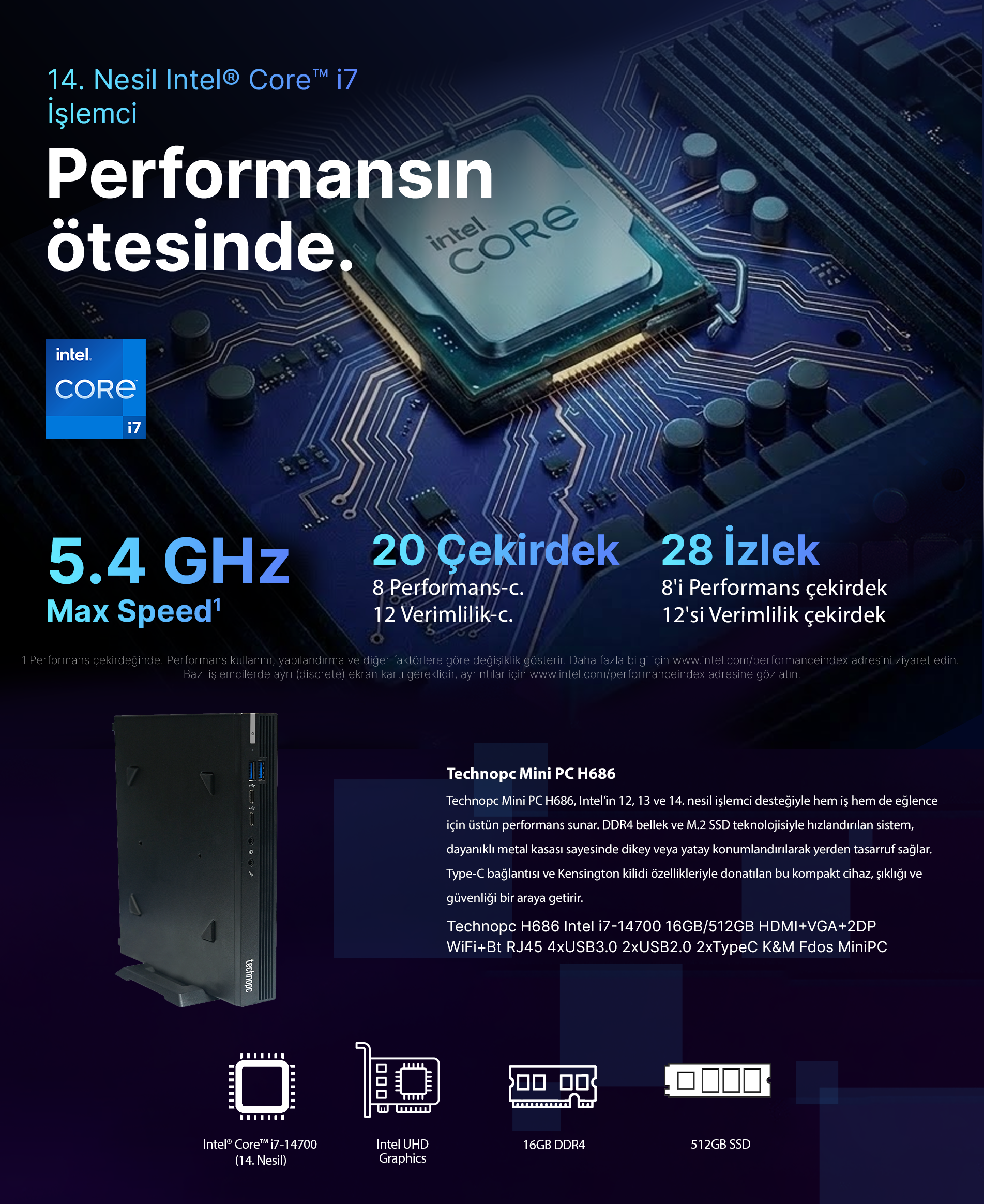 Technopc Mini PC H686, güçlü Intel 12/13/14. nesil işlemci ile donatılmış bir taşınabilir bilgisayardır. Bu sayede, hem iş hem de eğlence için yüksek performans ve hız sunmaktadır. DDR4 bellek ve M.2 SSD desteği, hızlı ve etkili bir bilgisayar deneyimi sağlar. Ayrıca, bilgisayarın dayanıklı metal kasa tasarımı, hem şık bir görünüm sunar hem de dikey ya da yatay kullanıma uygunluğuyla yerden tasarruf sağlar. Technopc Mini PC H686'nin çok yönlü bağlantı özellikleri arasında Type C çıkışı ve Kensington kilidi bulunmaktadır. Type C çıkışı, modern cihazlarla sorunsuz bağlantı imkanı sunarken, Kensington kilidi güvenliğinizi artırır. Bu mini PC, güçlü performansı, şık tasarımı ve geniş bağlantı seçenekleriyle kullanıcıların beklentilerini karşılamak için ideal bir tercihtir.